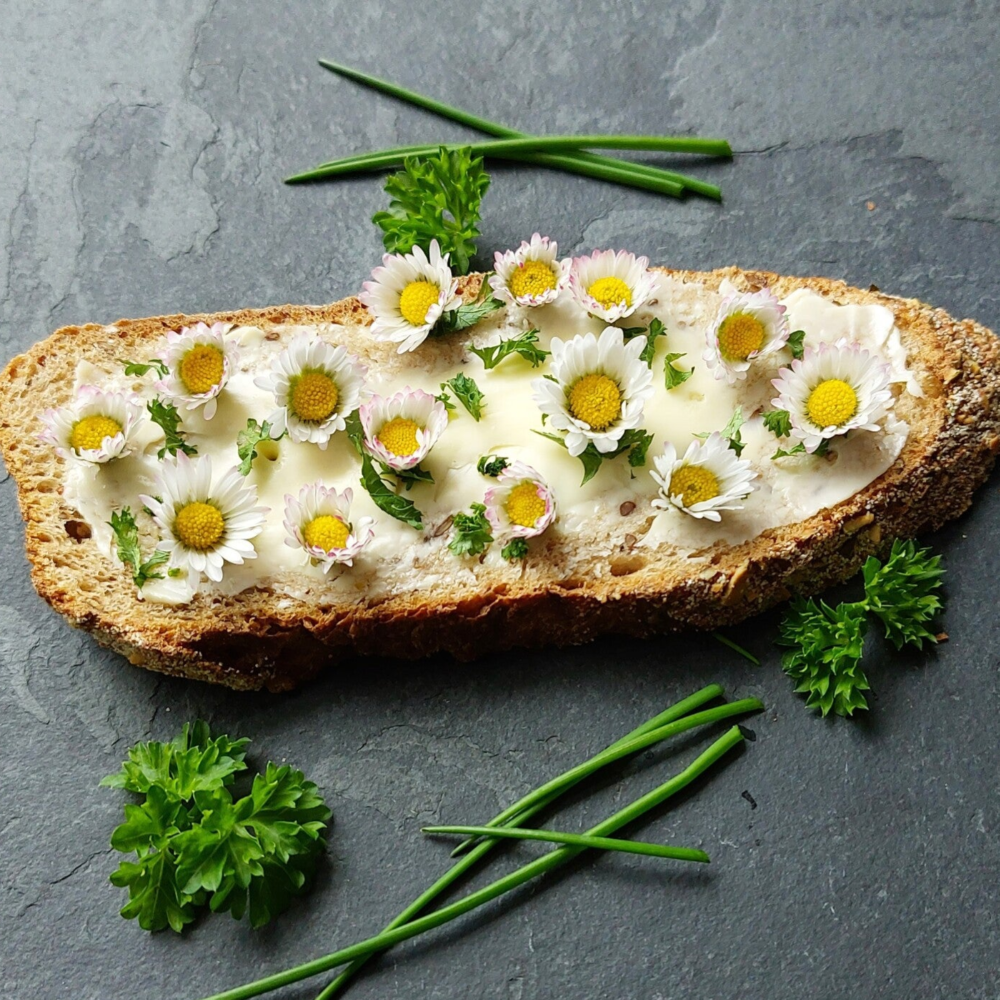 Die Scheibe Brot mit Butter bestreichen und je nach Belieben mit Kräutern ergänzen. Die Gänseblümchen-Köpfchen waschen und frisch auf das Butterbrot legen.